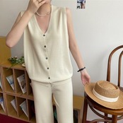レディース 2点ニットセット オフィスカジュアル セットアップ ノースリーブ ベスト 体型カバー ワイドパンツ きれいめ