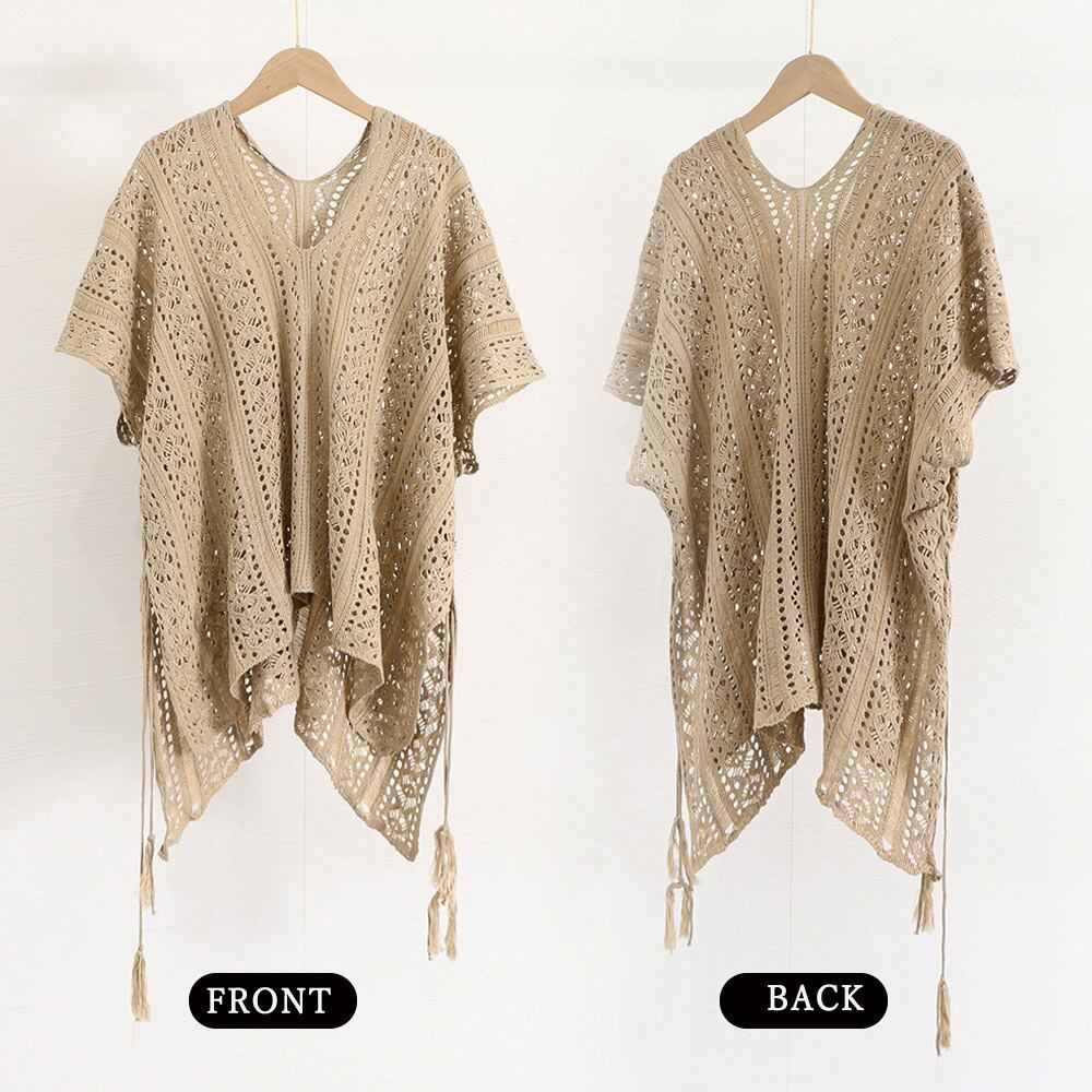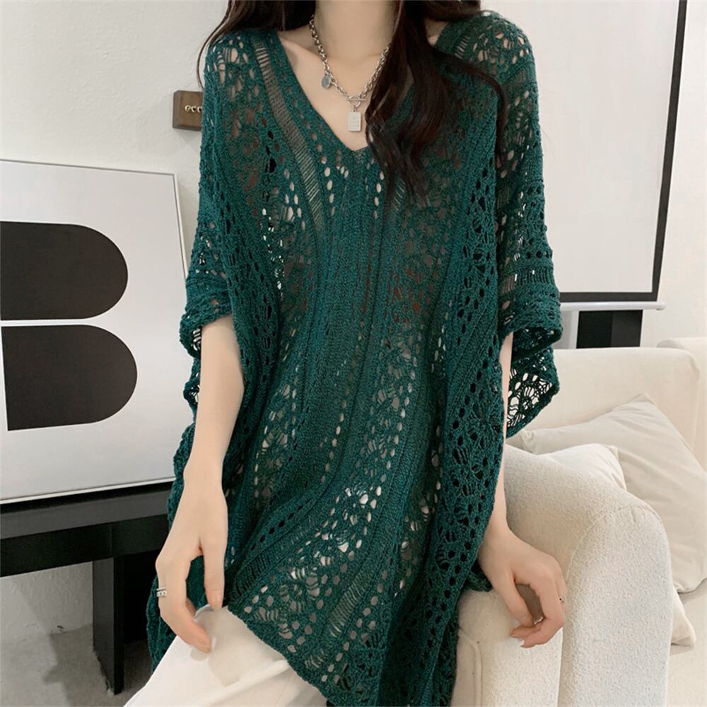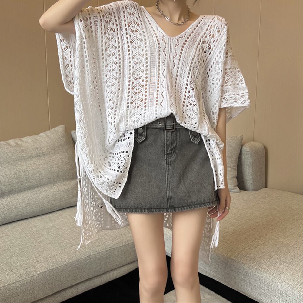 セクシー 体型カバー ニットトップス夏 レディース ゆったり Vネック 透け感ゆるニットプルオーバー クロシェ編み 韓国