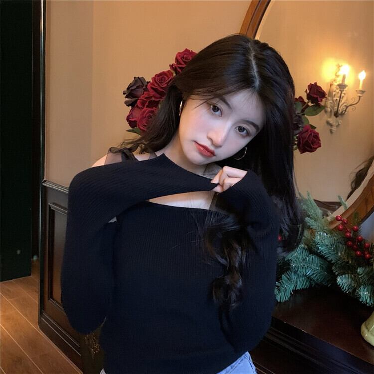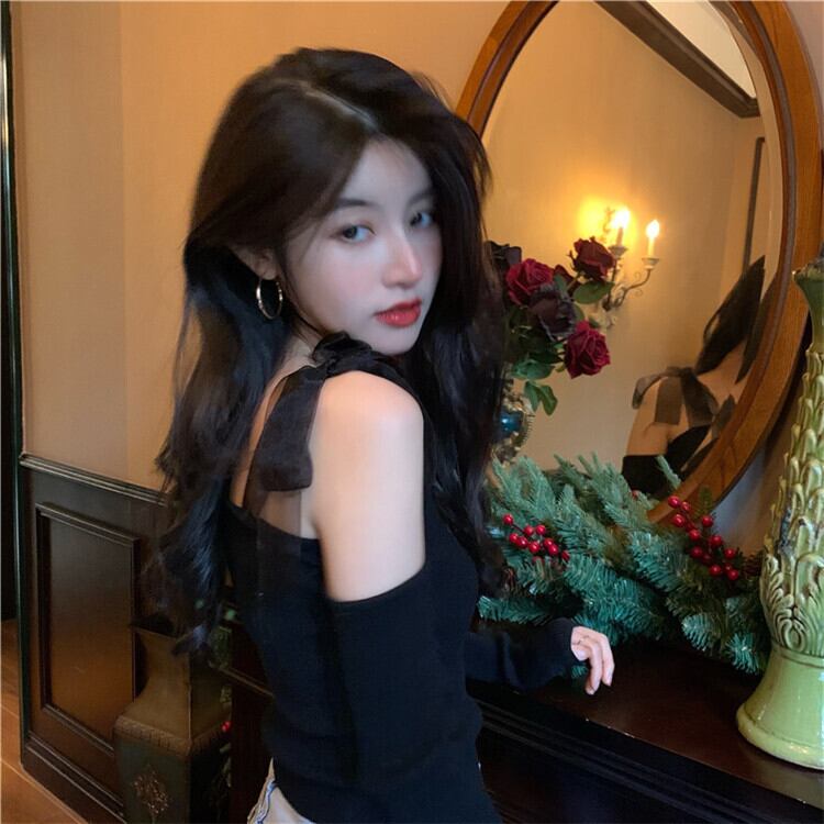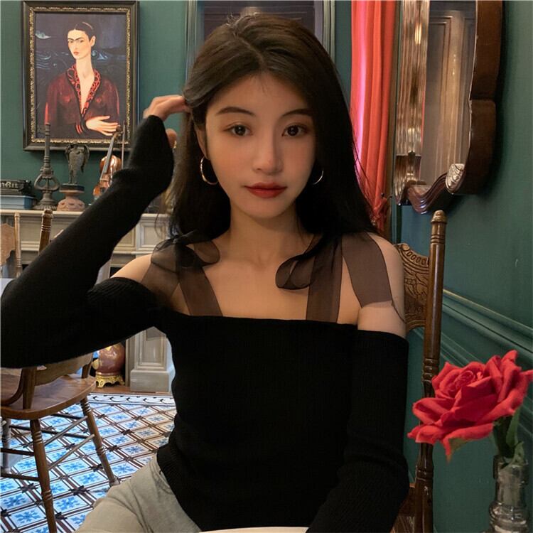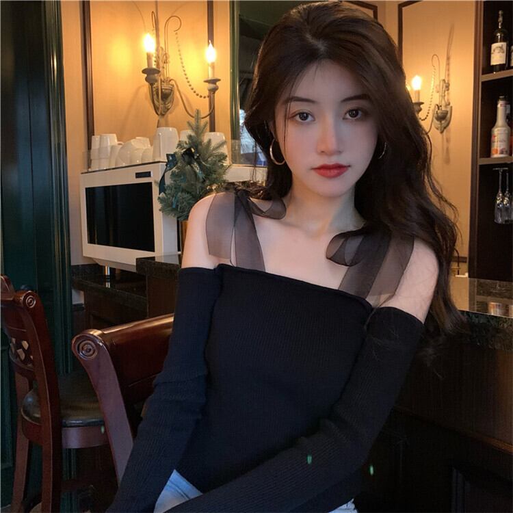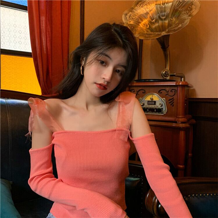 INSスタイル ちょう結び 縫付 気質 オフショルダー 編み物 トップス