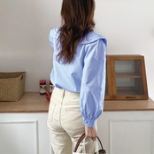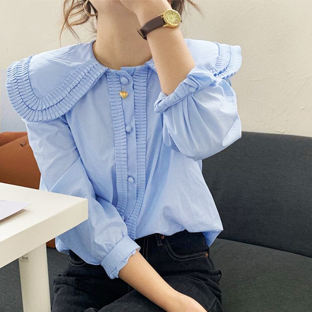 フリルで縁取られた大きめの襟は存在感抜群の長袖シャツブラウス