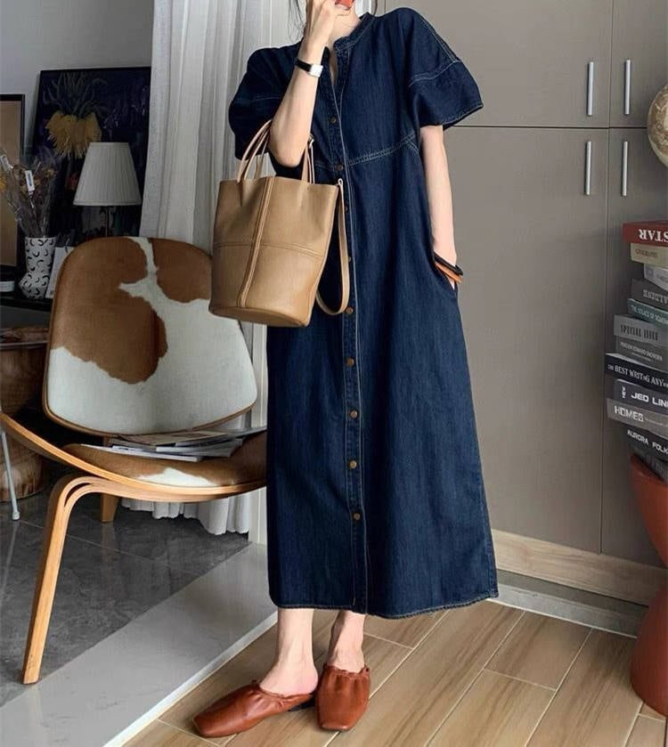 デニムワンピース 半袖 ラウンドネック 体型カバー 上品 レディース