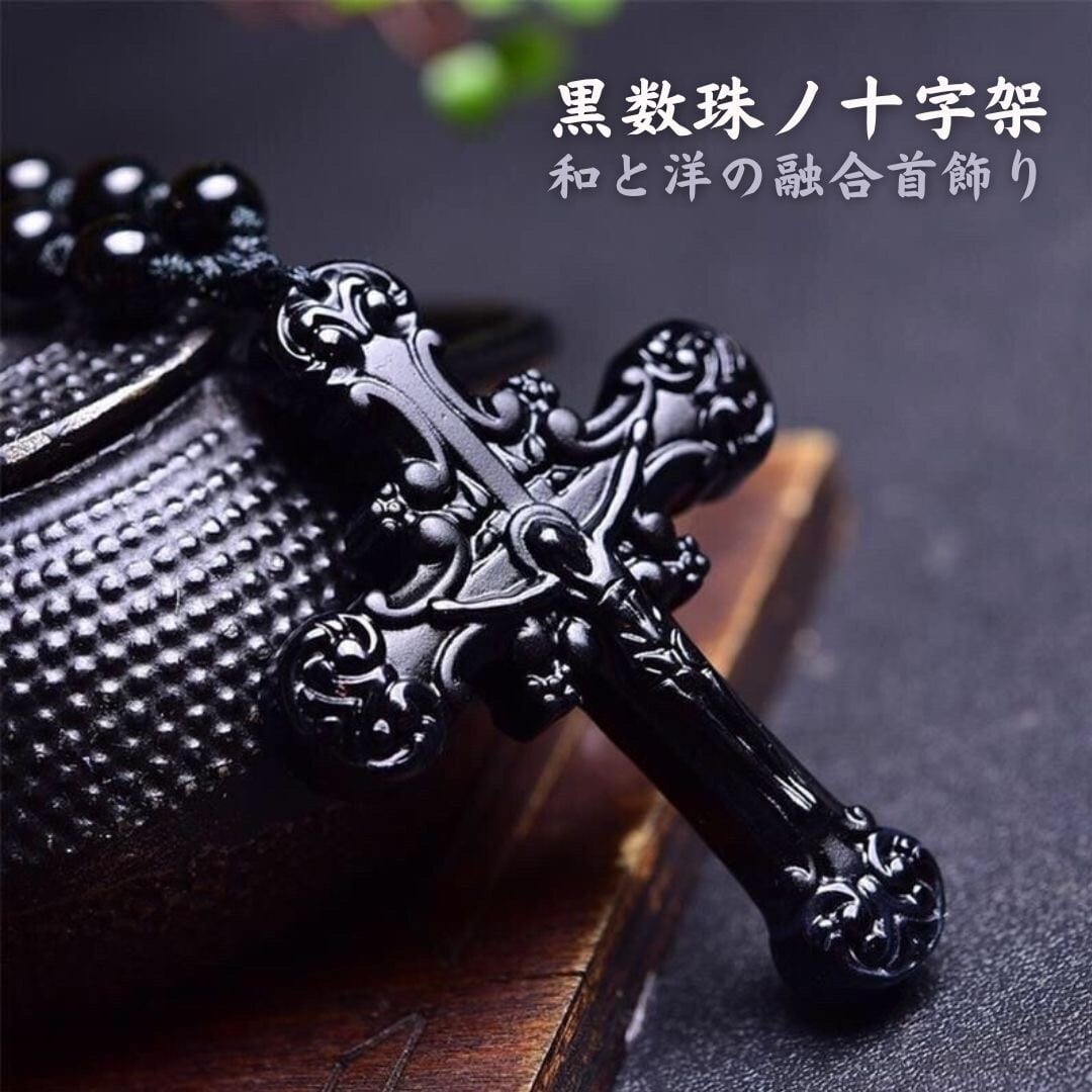 ネックレス 黒数珠 ネックレス 和と洋の融合 十字架 キリスト 首輪 紐 アクセサリー お守り 厄除け